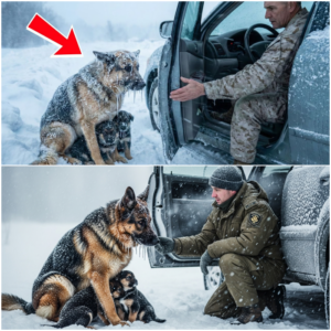 On a desolate mountain pass, amidst a blinding blizzard, a mother German Shepherd lay freezing to death. Her body curled tightly around two…