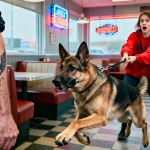 The glass shattered before anyone saw the dog move. One second. The German Shepherd lay motionless beneath the diner booth. The next, he…