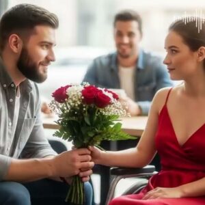 an upscale coffee shop late afternoon laughter fills the air a simple man in a gray shirt walks in holding a small bouquet…