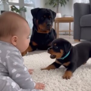 Rottweiler’s puppy tried to attack the baby. What Rottweiler mom did next amazed everyone. The Rottweiler charged straight at the baby…