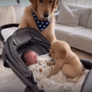 This golden retriever let her puppy near the baby. No one expected what happened minutes later. The golden retriever wouldn’t stop…