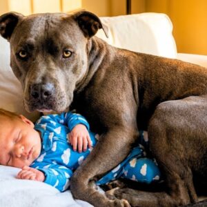 The pitbull wrapped his paws around the sleeping baby and refused to let go. When Emily tried to lift her son…