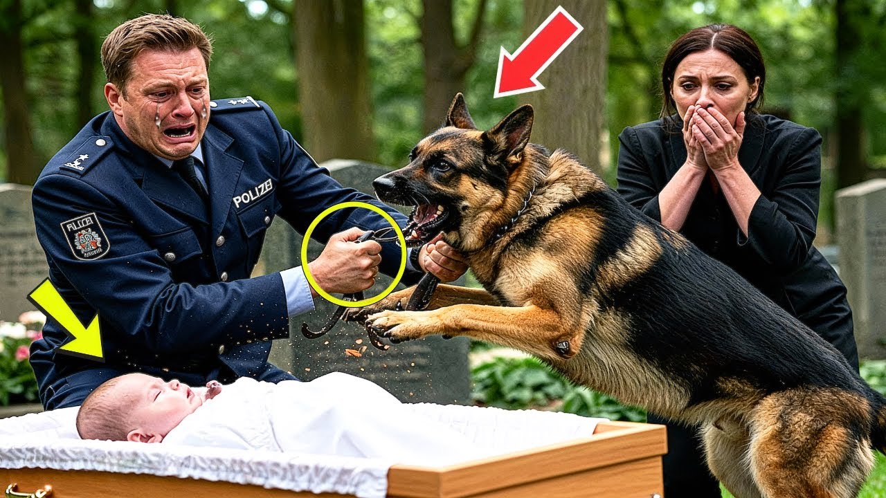 “Call an ambulance,” Lucas yelled. Rex stood guard beside the coffin. hackles raised, teeth bared. Not at the baby, but at the funeral director, who slowly backed away, face pale, eyes darting. Lucas noticed immediately. “Why are you stepping away?” He demanded, pointing at him.