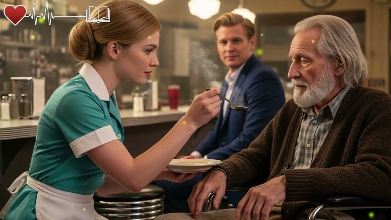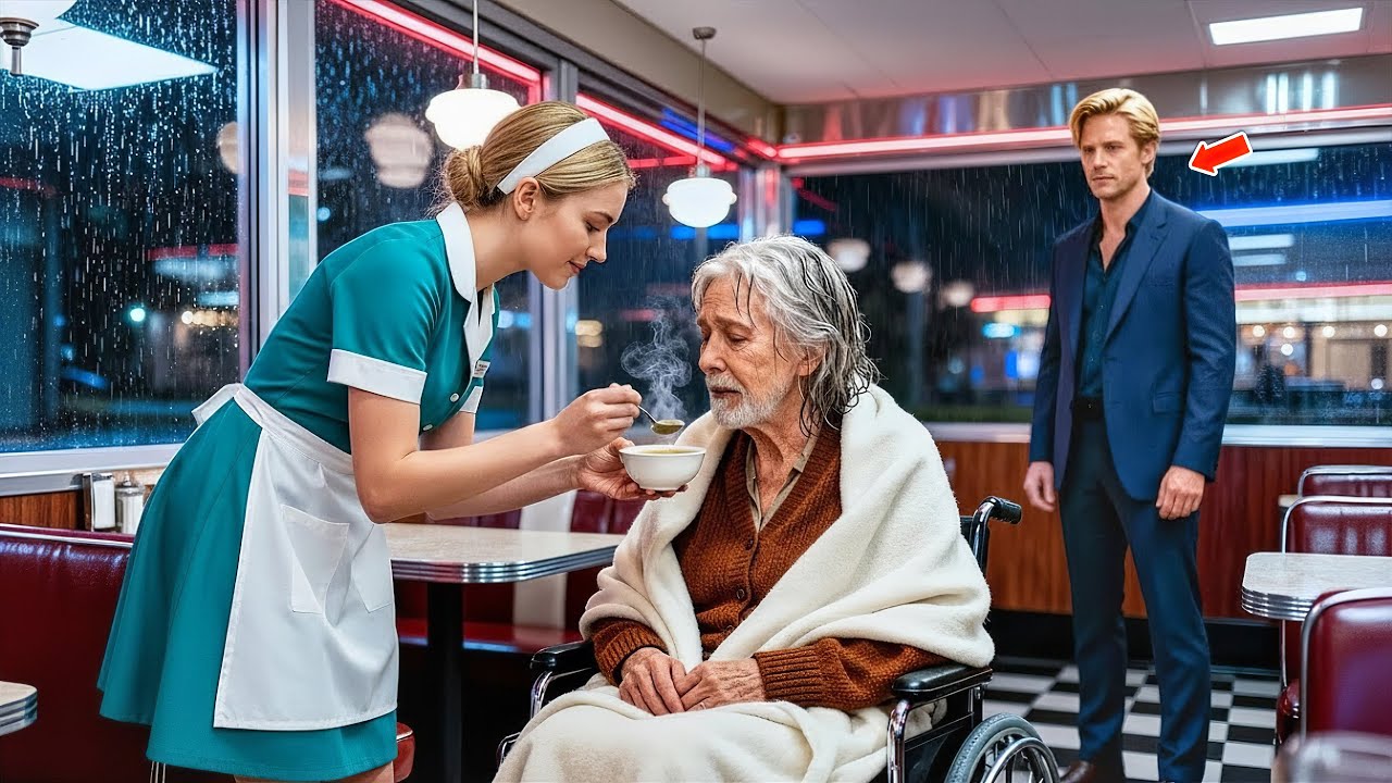 On a cold metal wheelchair near the corner booth, sat an elderly man wrapped in a thin blanket, shivering slightly from the storm he had just escaped. Beside him, a young waitress named Mara gently lifted a steaming spoon of soup to his lips, her hands trembling from exhaustion, but her face full of quiet compassion. She didn’t know that at that exact moment, a billionaire named Rowan Hail was stepping through the doorway, nor that what he saw would change both of their lives forever.