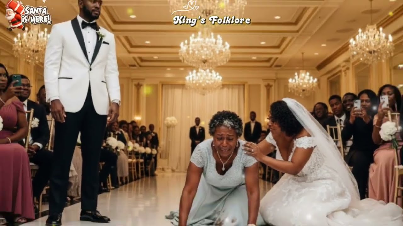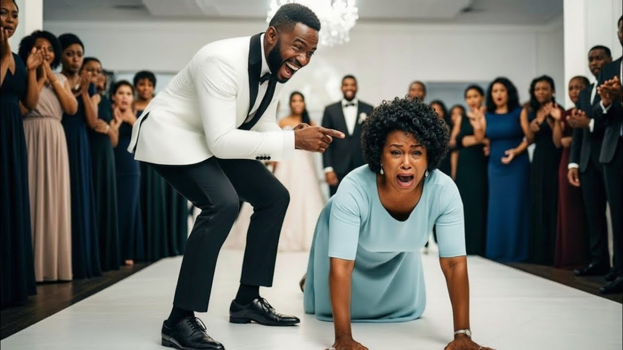 Dererick’s fianceé, Alyssa, stood at the altar, glowing in her ivory gown, completely unaware of the humiliation about to unfold. The guests murmured, their attention turning toward the mother, who now faced the impossible. Her knees hit the polish floor. Every inch she crawled was a battle against shame and love.