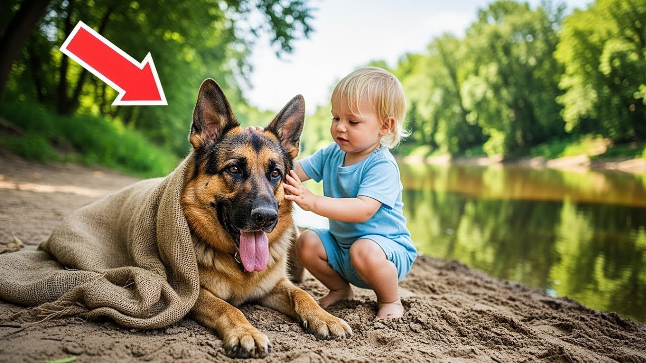Everyone thought the German Shepherd was dead, tied in a sack and hurled into the river like trash. But when a tiny baby crawled to the water’s edge, what happened next stunned the entire crowd. The riverbank was quiet that morning, the water gliding past and slow. It should have been a peaceful scene, but something out of place drifted near the shore.
