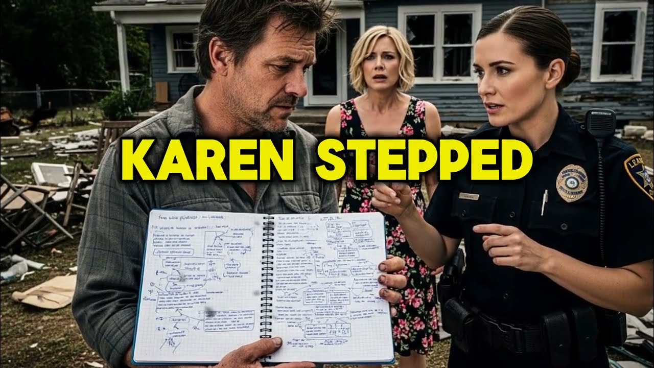 But the biggest twist came next. The second officer walked over holding something he’d found near. Karen’s fence, a notebook. He handed it to me. Inside were pages. months of detailed notes about my schedule, my lights, my visitors, even what time I took out the trash. This wasn’t just nosiness. This was obsession. Karen looked at me with watery eyes, whispering, “I was just trying to keep the neighborhood safe.