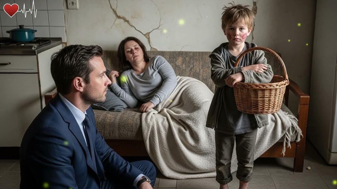 The winter winds howled outside the old crumbling apartment building, slipping through the cracks like icy fingers, searching for warmth. In a dimly lit kitchen, a small boy stood barefoot on the cold floor, clutching an empty wicker basket to his chest. His face was stre with dirt and dried tears, and his lips trembled, not just from the cold, but from fear.