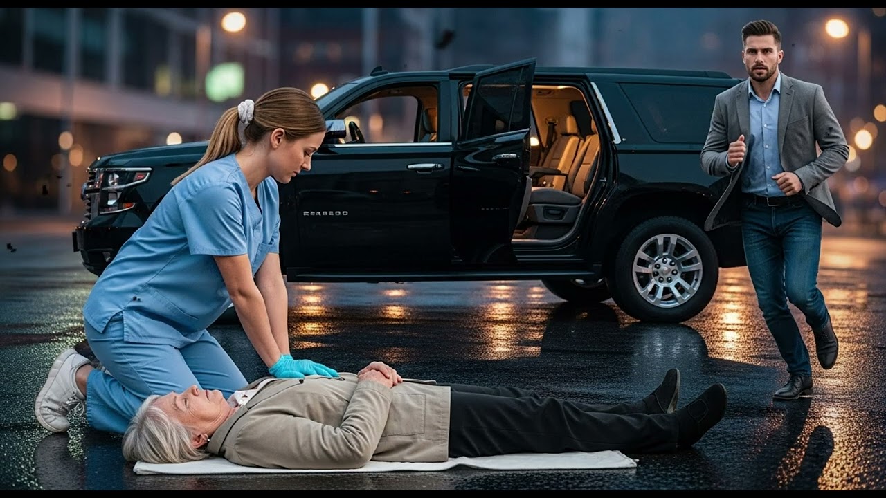 That’s when she saw the woman. She was elderly, perhaps in her 70s, with silver hair styled elegantly despite the damp weather. She wore a cream colored blazer and dark slacks, the kind of outfit that spoke of quiet wealth and refinement. The woman was leaning heavily against a black SUV, one hand pressed to her chest, her face pale as moonlight. Emma didn’t hesitate.