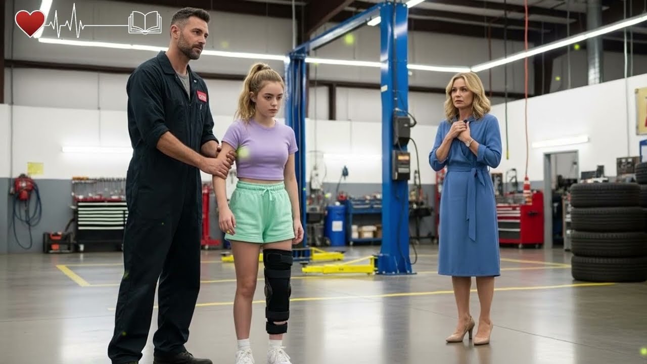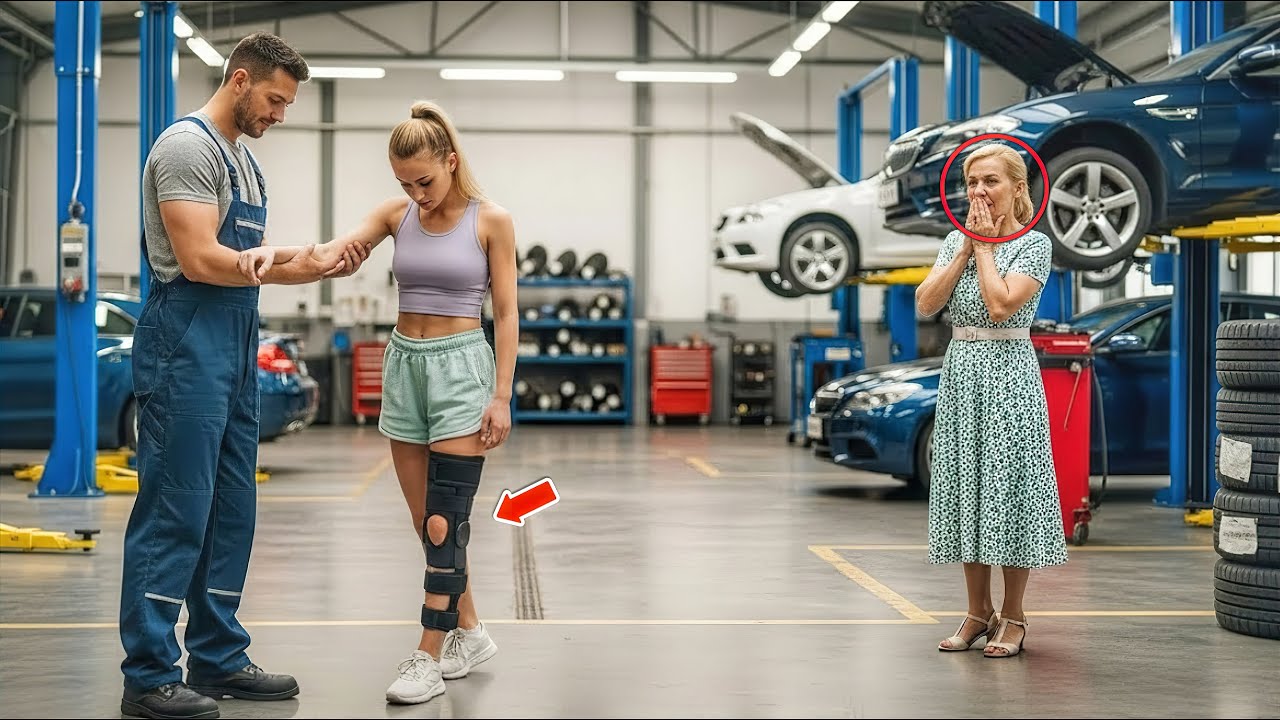 Standing near the open bay door was a pair that radiated distress. The girl, Chloe, couldn’t have been more than seventeen. She was pale, dressed in athletic shorts and a sports top, but her lean, muscular physique was betrayed by the bulky, intimidating orthopedic knee brace strapped to her right leg. An angry red arrow, an unfortunate detail he failed to notice, seemed to underscore the severity of the brace. Her blonde hair was pulled back, revealing a strained, defeated expression. Beside her, a woman in a floral sundress, Mrs. Evelyn Reed (Chloe’s mother), stood with her hands clasped over her mouth, her eyes wide with a mixture of terror and frustration. This was the woman whose face was circled in the image—the mother at her breaking point.