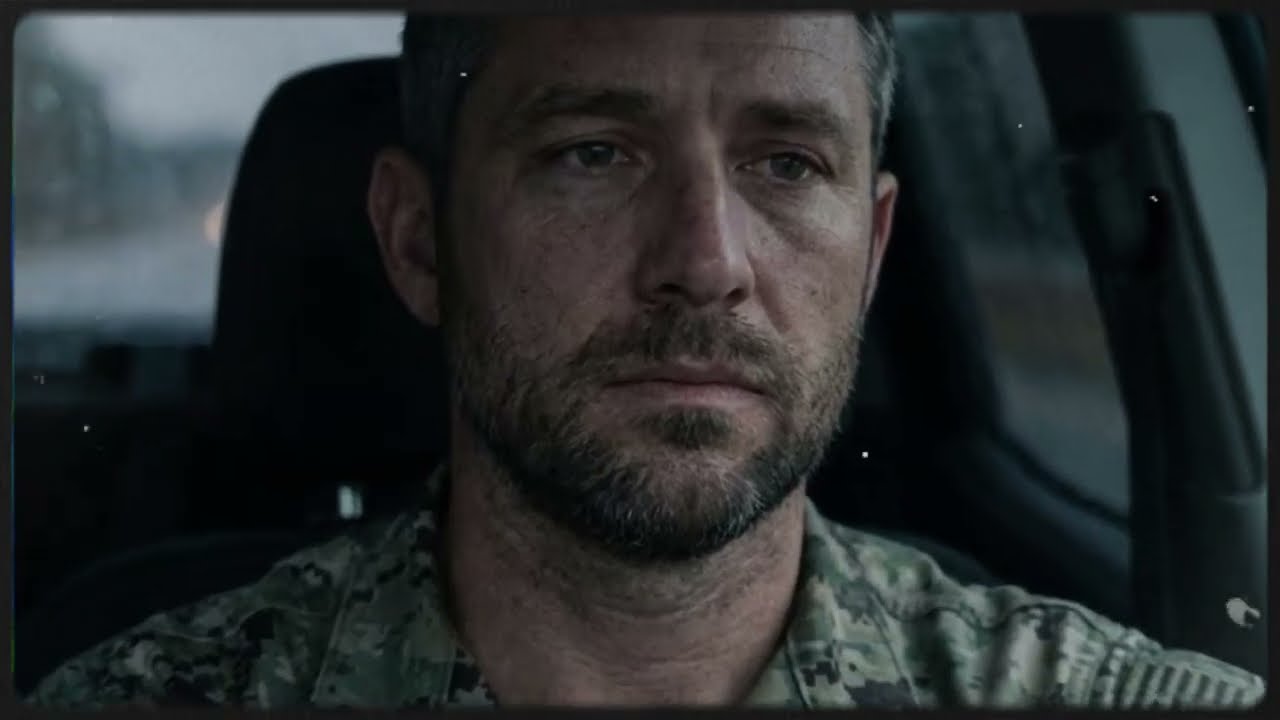 He sat hunched behind the wheel of his pickup truck, windshield wipers scraping back and forth in a rhythm that filled the silence. He was 38, broad shouldered, his face weathered by time and war. A light stubble covered his jaw, silver threading through dark hair at his temples. There was a certain hardness to his features, the kind carved by duty and loss, but beneath it a deep weariness.