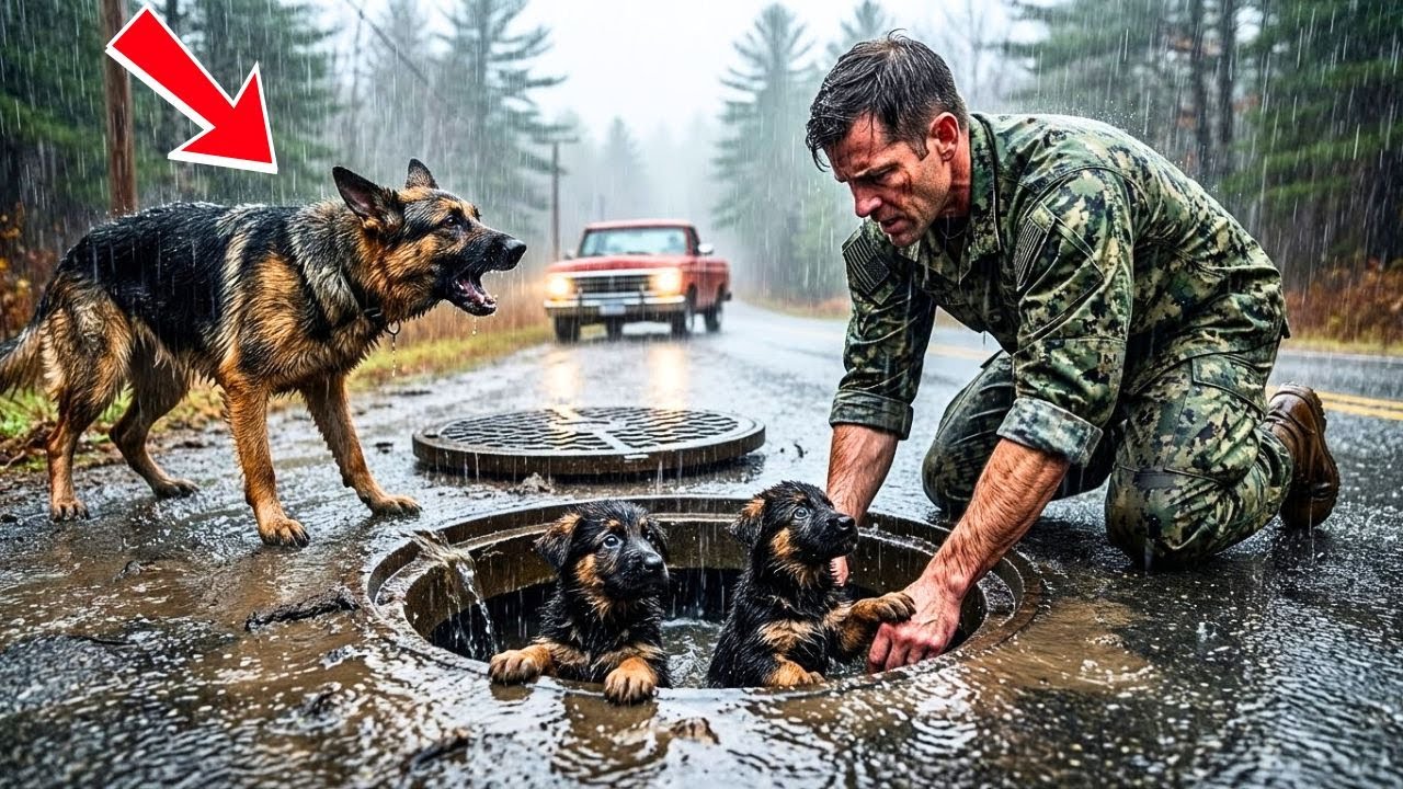 A mother dog stood trembling beside a storm drain, her paws buried in the mud, her cries echoing through the cold Vermont rain. Inside the drain, two tiny German Shepherd puppies clung to the metal edge, their bodies soaked, their voices weak, calling for a miracle that might never come. Miles away, a Navy Seal named Jake Turner drove through the same lonely road, headlights cutting through the mist, mind lost somewhere between war and silence.