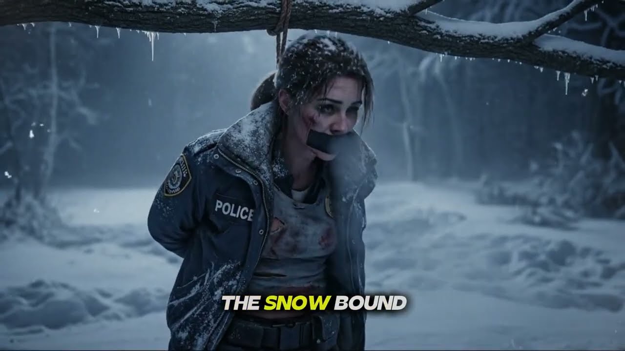 Thick rope bit into her wrists and ankles, hoisting her at an angle that twisted her spine unnaturally. Her mouth was sealed with dark tape, stiffened by ice, and her breath emerged in faint, uneven bursts that barely disturbed the air. She wore a torn winter jacket over what had once been a police uniform.