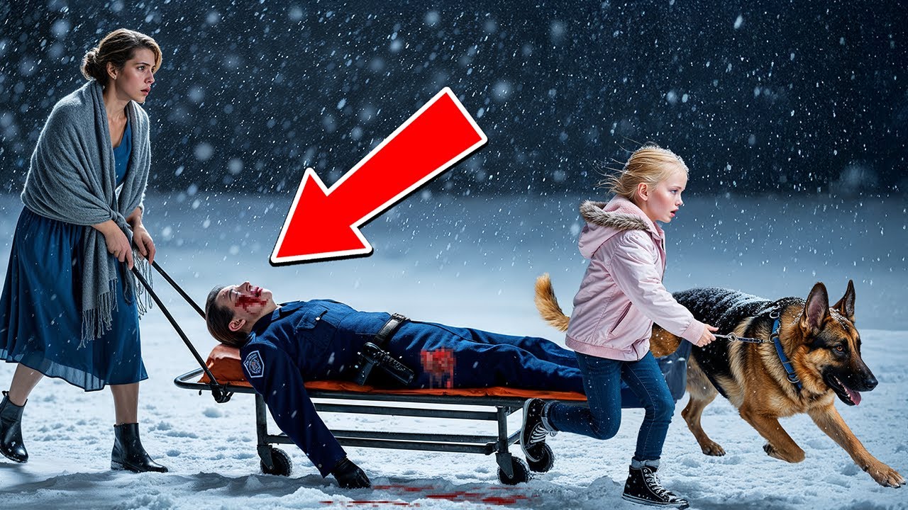 She remembered her husband’s badge, the weight of it on their table the night before he left. She remembered how the town spoke about police now half respect, half suspicion. Ranger circled the man, sniffing, barking low, then pressing his nose against his shoulder as if urging Evelyn to act. Lily stood a few steps behind her small figure, shaking in the wind.