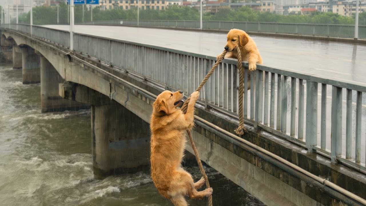 Look at this beautiful golden retriever and her tiny fluffy puppy walking side by side across a giant city bridge. A car comes speeding too fast. The mother dog doesn’t see it coming. She’s knocked over. The puppy, he’s left standing alone on the bridge. His mom is gone and he won’t stop crying for her.