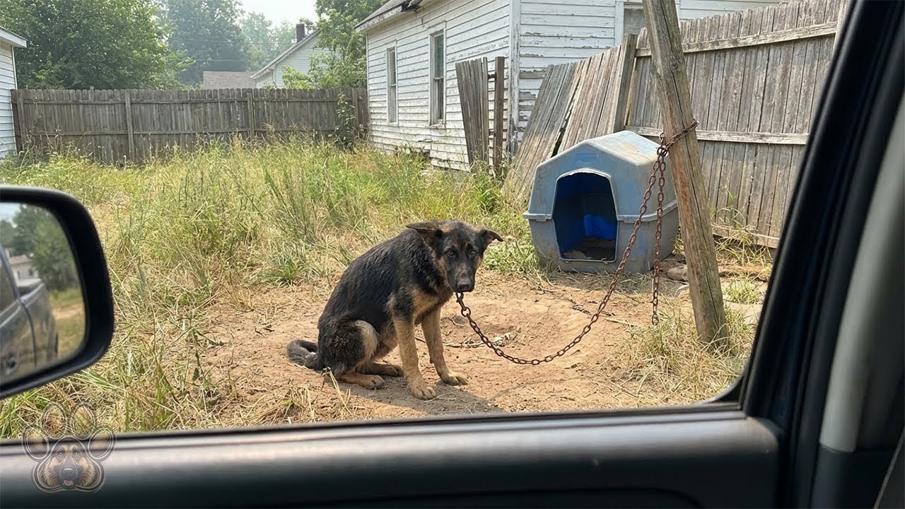 Black and tan, ribs like piano keys under dull fur, eyes that didn’t look at anything directly, just stared through it. There was a cracked plastic doghouse behind him, tipped sideways. No food, no water, just a brown ring of trampled earth where he’d paced the same few feet over and over again. I parked. Something about the way he sat, tail tucked under, ears half down, spine curved like he was trying to disappear.