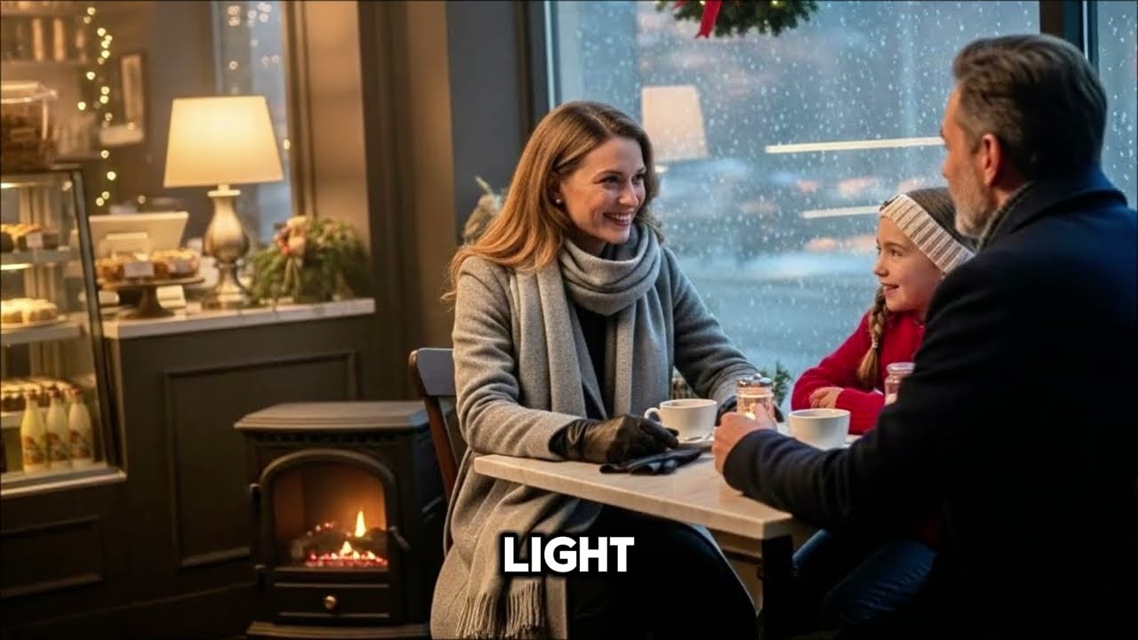 Holly darted to a corner table near a small fireplace as if afraid the warmth would disappear if she didn’t claim it quickly Ryan and Audrey followed more slowly they sat down Audrey across from Ryan Holly next to her father the fire crackled steadily beside them outside snow continued to fall quiet as a whispered lullaby Holly leaned forward so excited she nearly forgot to breathe we have a Christmas tree at home it’s only 1 m tall but it has real candy canes and I made the star from cardboard and glitter that sounds magical Audrey said softly