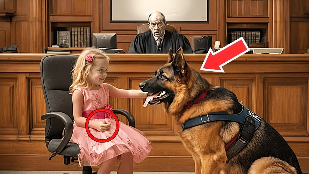 She seemed fragile, barely old enough to understand why she was there. Then the little girl did something no one expected. She gave the dog a tiny secret signal, barely visible to the human eye. But the dog saw it instantly. Rex had already understood her silent plea for help. Rex, the massive German Shepherd sitting beside her, lifted his head the moment the girl’s hand moved. His ears shot up.
