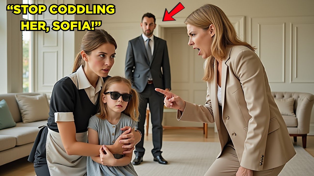 As he moved toward the grand living room, he suddenly froze. A faint sound drifted through the vast space. Muffled sobs mixed with a soothing, gentle voice. Ethan narrowed his eyes, heart beating faster as he recognized his daughter’s voice. Laya. She was only seven, her eyes always hidden behind dark glasses, sitting on the cold marble floor, clutching a worn out teddy bear to her chest.