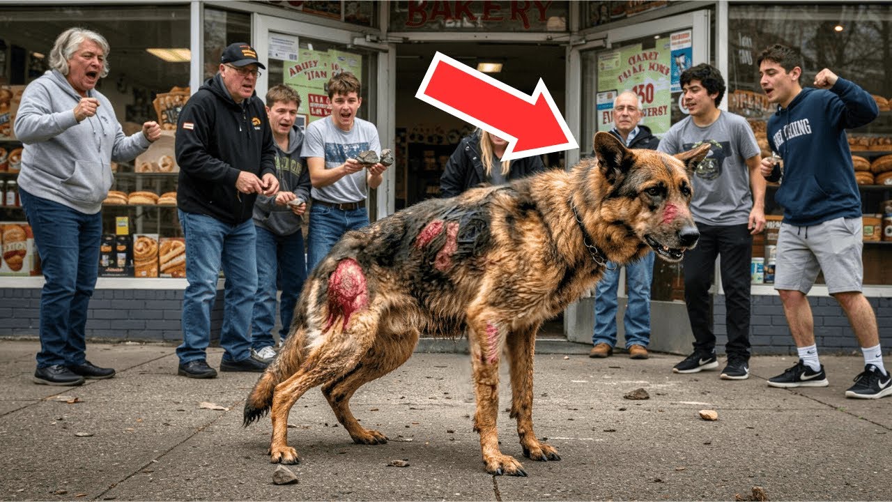 The crowd gathered outside Sweet Liberty Bakery fell silent as Mason Hayes stepped through the door. His weathered hands trembling with rage. The German Shepherd huddled against the building flinched as another rock skittered past, thrown by a teenager at the edge of the mob. That’s enough.
