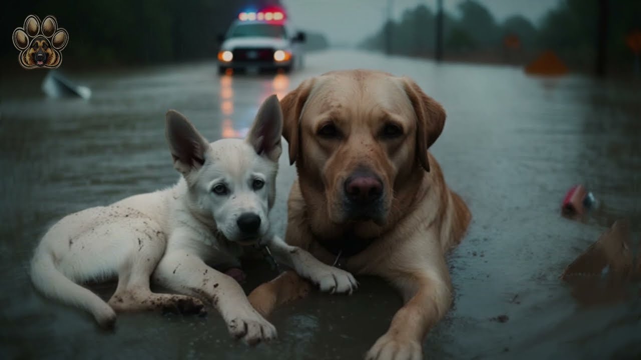 ” But even I didn’t believe that yet. I radioed for blankets and medkits. The water around us rippled with fresh rain. And still, the Labrador didn’t move. He just kept his head low, eyes on me as if asking one silent question. Don’t take him away from me. I didn’t. I wrapped them both in the same tarp. I carried them out together, muddy, heavy, soaked in silence, one dog limp with exhaustion, one trembling with fear, and somehow neither willing to leave the other behind.