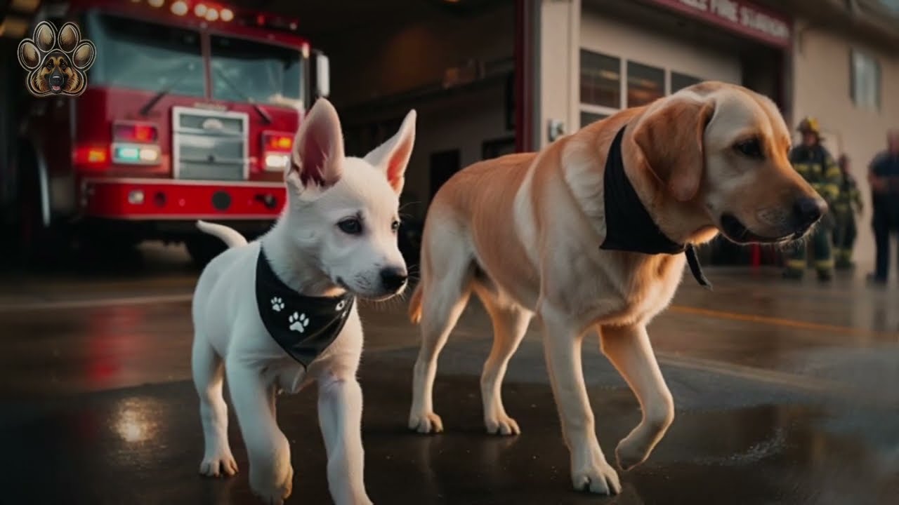 The German Shepherd puppy didn’t move. He let Rise fasten the buckles gently around his chest, his snowy white fur peeking out beneath the fabric. He looked up once toward Hugo, and then straight ahead at the group of firefighters watching in silence. Then he sat strong, still proud. The room exploded in soft applause, and I felt it deep in my bones that something had changed.