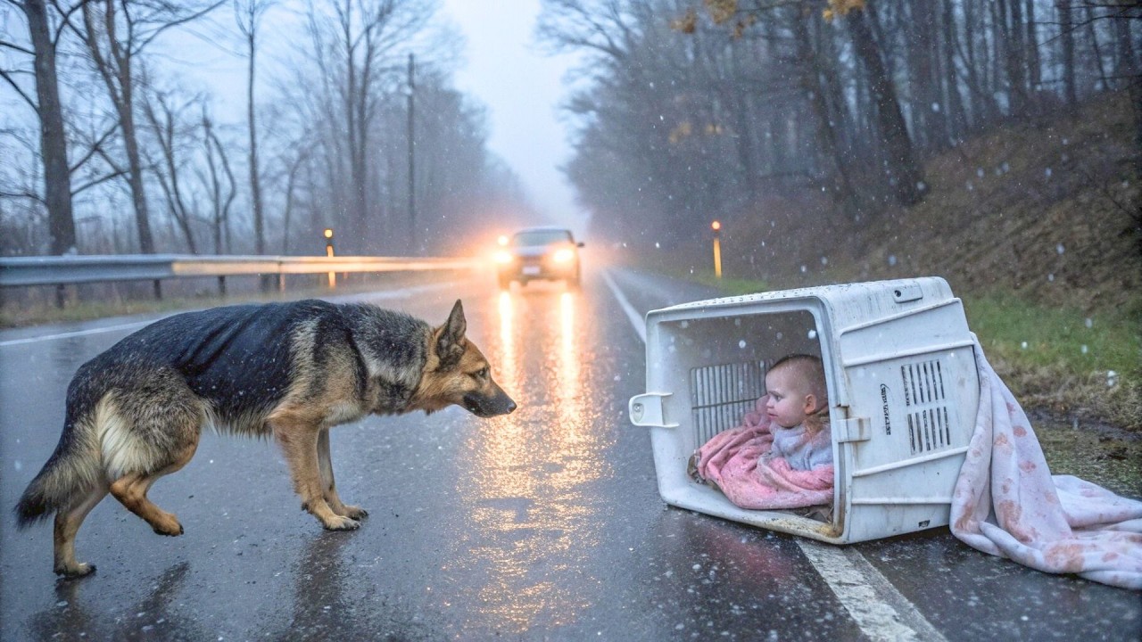 The rain came down in sheets, driven sideways by howling wind that screamed through the bare trees lining the deserted highway. It was near midnight on the outskirts of a quiet Midwestern town, and the storm showed no signs of relenting. The world was soaked, cold, and unforgiving. A German Shepherd limped through the shadows of a narrow alley near the woods, ribs visible beneath his soaked, matted fur.