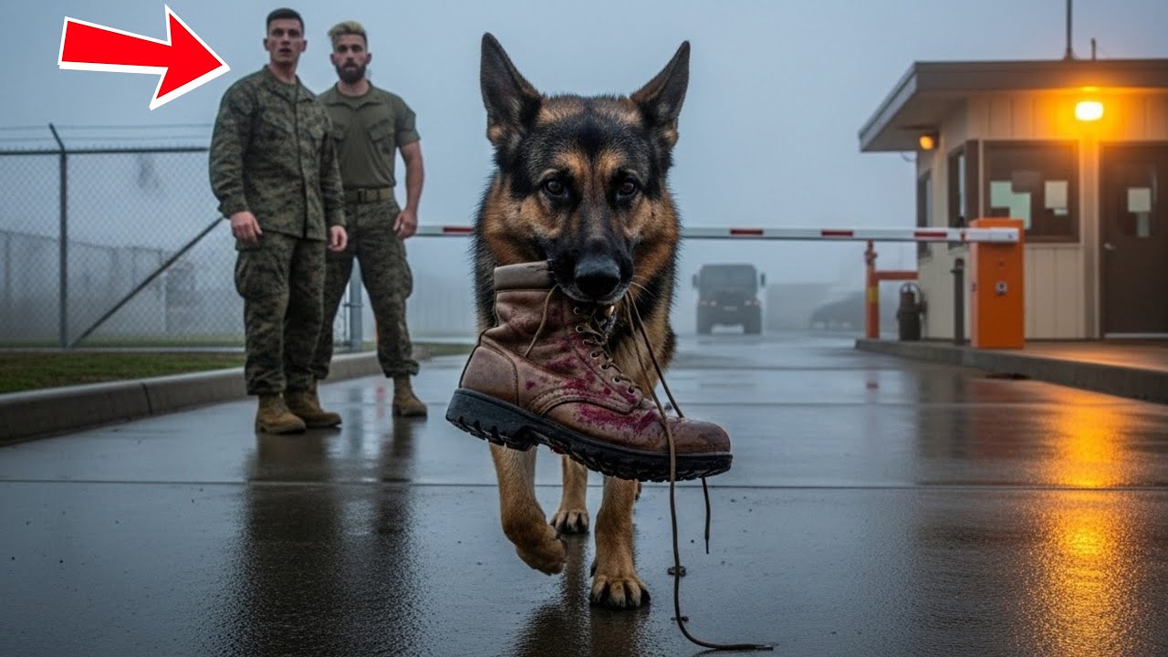 A German Shepherd stumbled out of the coastal fog at dawn, limping, his gray black coat stre with scars and old blood. Between his teeth, he carried a single Marine combat boot, its laces torn, its leather soaked in crimson. He was not supposed to be here. No one expected him at the gate of a US Marine base in Seabbrook, North Carolina.