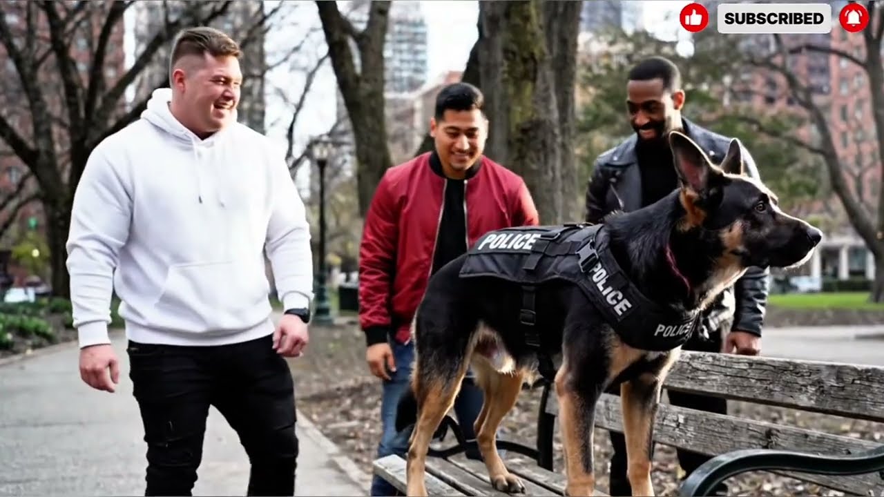Rex stayed seated on the weathered wooden bench. his powerful body wrapped in a black tactical vest marked clearly with the word police. The letters slightly worn from use, but the warning meant nothing to men who confused arrogance with strength. And one of them leaned forward again, pressing his foot harder this time, testing boundaries, provoking a response, treating a living, breathing protector like an object placed there for their amusement.
