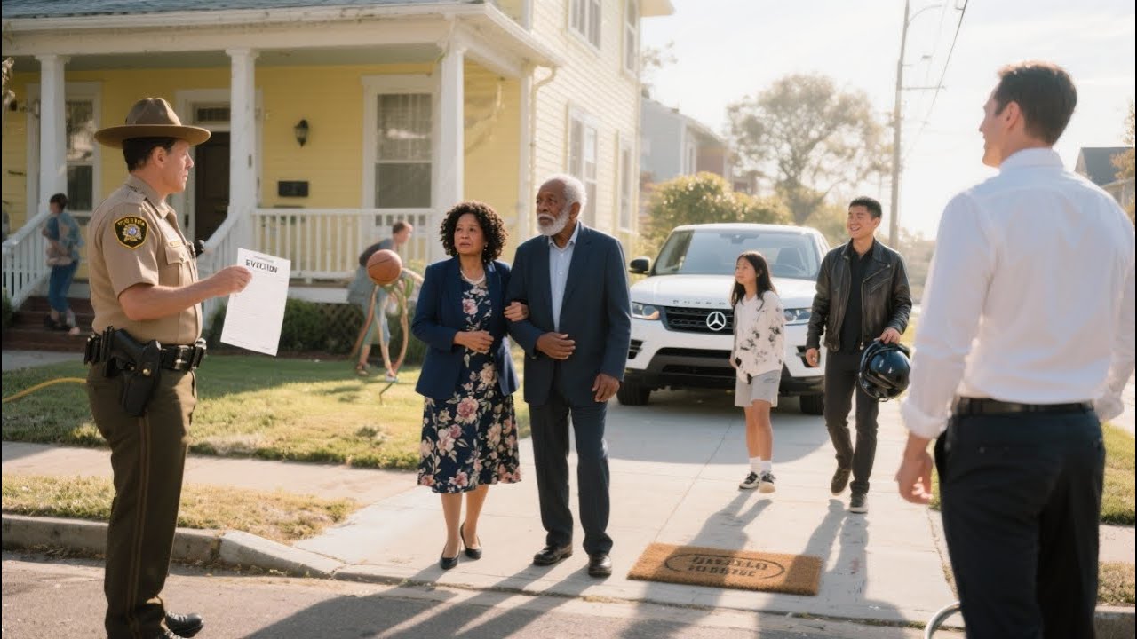 Eleanor’s fingers curled tight around the brass key. Walter’s cane braced firm against the top step. She drew in a breath, held it for a beat, and crossed the lawn with deliberate calm. The sheriff half turned, surprise flickering in his eyes. “Hold the eviction,” Sarah said, voice clear enough for the block to hear. She pulled papers from her case, pages shielded in plastic sleeves, stamped with the bold red of injunction.