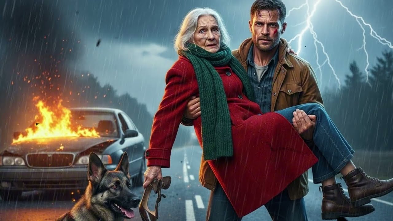 It started on a deserted highway where a veteran spotted a burning car through the sheets of rain. Inside, an elderly woman shook in terror. Haunted by the same thunder that once took her family, he pulled her out seconds before the flames exploded behind them. By dawn, she was safe.