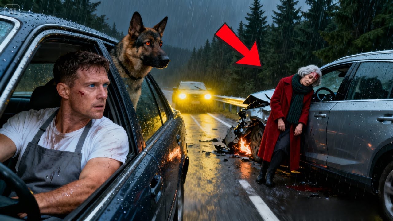 Elias slammed on the brakes. The truck hydroplaned for a moment before grumbling to a stop. Ranger barked sharply. No fear, only urgency. Elias’s pulse hammered against his throat. Without thinking, he threw open his door and ran into the downpour, the cold slicing into him like a blade. Ranger bounded out right behind him, paws splashing through the rising water pulled along the highway.