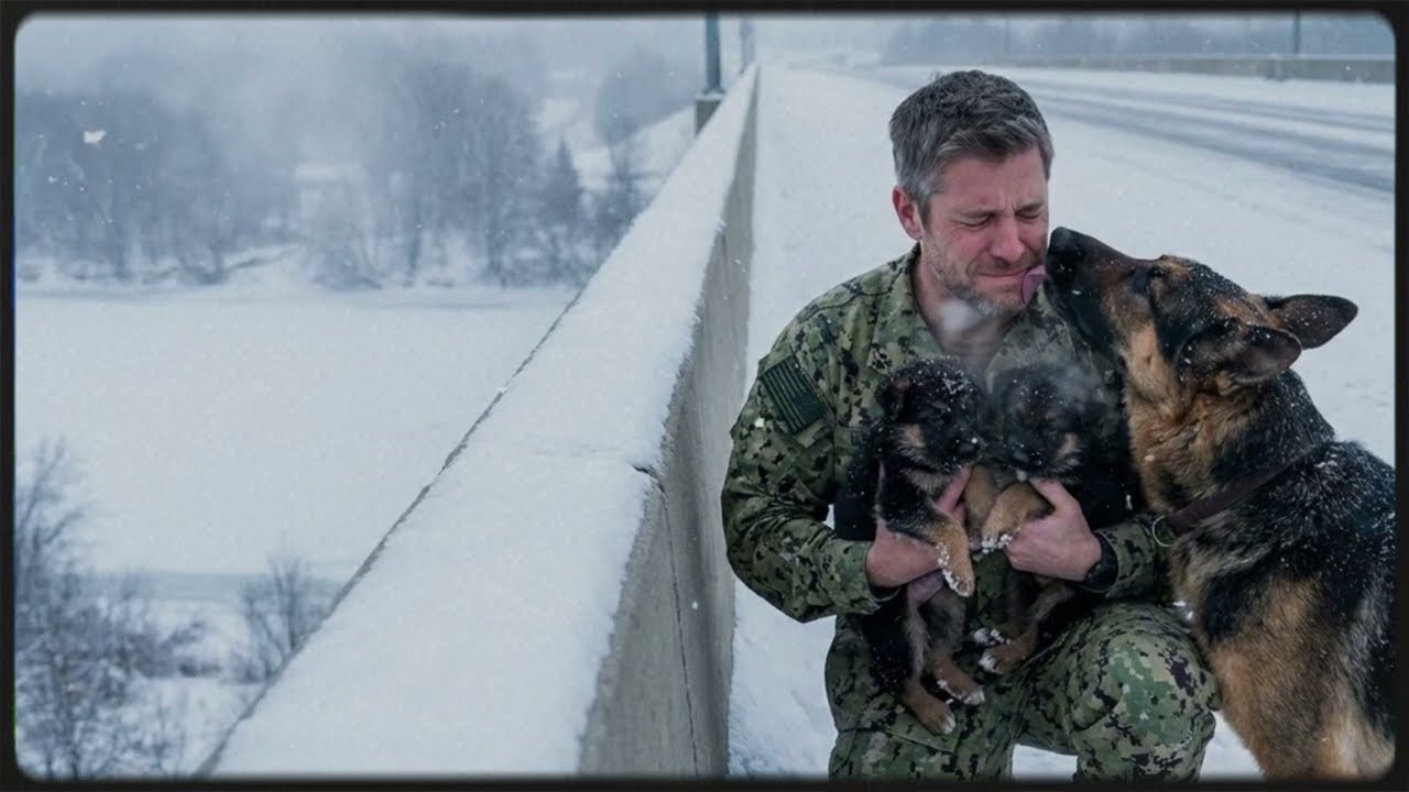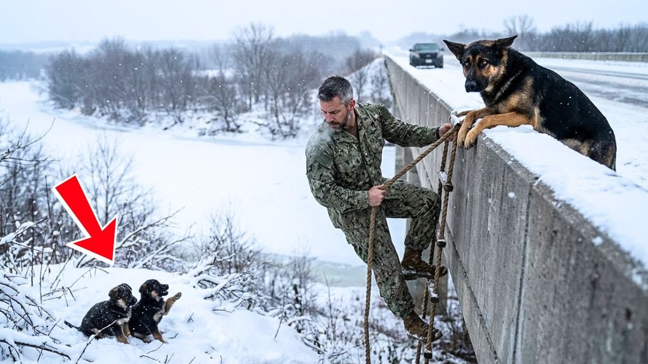 A lone German Shepherd stood at the edge of a frozen bridge, barking into the endless white below. Far beneath two tiny shapes trembled against the snow. Their cries swallowed by the wind. And then came a man in uniform, a Navy Seal with eyes that had seen too much, hands that had saved too little. He didn’t know why he stopped or why his heart began to race like it once did in war.