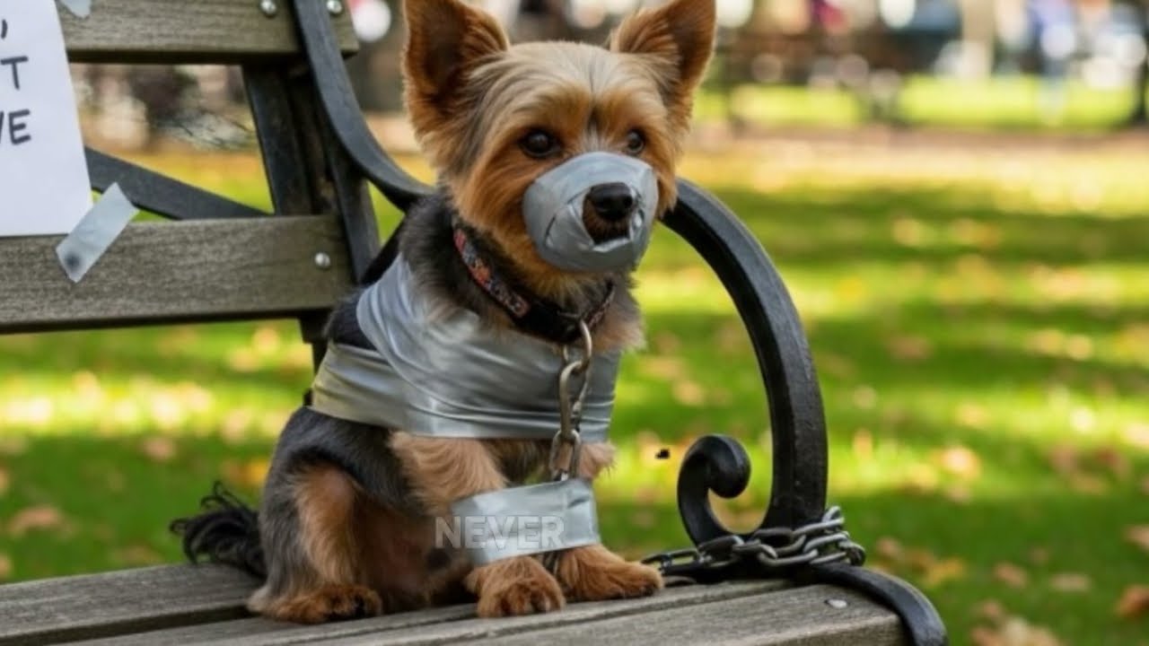 But he wasn’t just sitting there. He was encased in silver duct tape. Wide industriallooking strips were wrapped around his little torso, pinning his front legs to his sides. Another piece was crude. They wound around his muzzle. A cruel silencing gag. A heavy, ridiculously oversized metal chain was looped around his neck and then padlocked to the armrest of the bench.