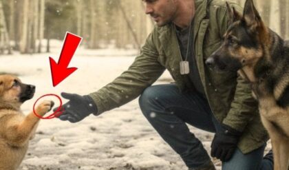 They weren’t warming fast enough. He looked at Athena, who stood watching him, her head cocked in confusion. I need you, he said, his voice softer now. Athena, help. It wasn’t a command. It was a plea. He didn’t know what else to do. He pointed at the pups. Athena stepped forward cautiously. She sniffed the largest puppy, then the second. Her cold nose touched their damp fur.
