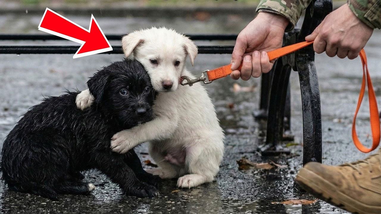 He began to whine again, soft chirps of encouragement. He nudged the black puppy’s cheek, then laid his chin over the stray’s neck. “I am here,” the gesture said. “You are not invisible anymore.” Elias felt something fracture in his chest. It was the wall he had built around himself, the wall of order and schedules and solitary walks.