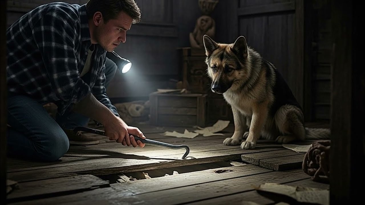 He gathered his tools, a crowbar, a hammer, and his flashlight, and returned to the spot by the fireplace. Rex stood close, tail rigid, ears pinned forward. With a grunt, the veteran wedged the crowbar beneath the warped planks. The wood groaned in protest before snapping loose, sending dust and splinters into the air. A rush of damp, foul smelling air seeped out from the dark hole beneath.