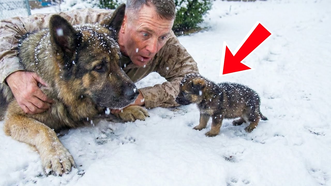 When he finally returned, dragging his frozen body through the snow, he carried a tiny purple corpse in his mouth. A newborn puppy, cold as stone. The Marines said it was too late. The storm had claimed them both, but the old dog lay down and did the unthinkable. He decided to trade his own dying sparks of life to ignite a new one.