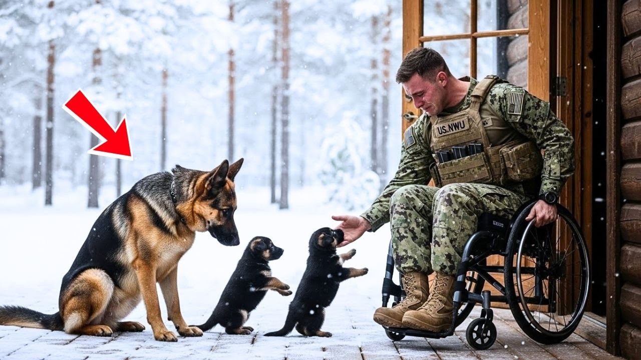 Through the swirling snow, a familiar shadow appeared. thinner, trembling, eyes still glowing with the same fierce love he thought he’d lost forever. Faith. But she wasn’t alone. Two tiny German Shepherd puppies stumbled beside her, their fur stiff with ice, their breaths faint, but alive. When he opened the door, she laid her head on his knee.