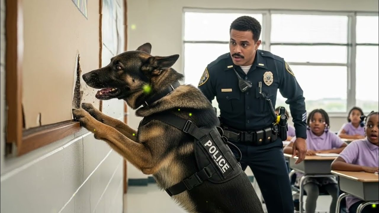 The scream that echoed through Maple Ridge Elementary that morning was not from a frightened child, but from a police K9, a deep, urgent bark that sliced through the commum of the school like a warning siren. Officer Daniels tugged at the German Shepherd’s vest, trying to pull him back, but the dog lunged again, paws scratching violently at an old painting that hung crookedly on the classroom wall.