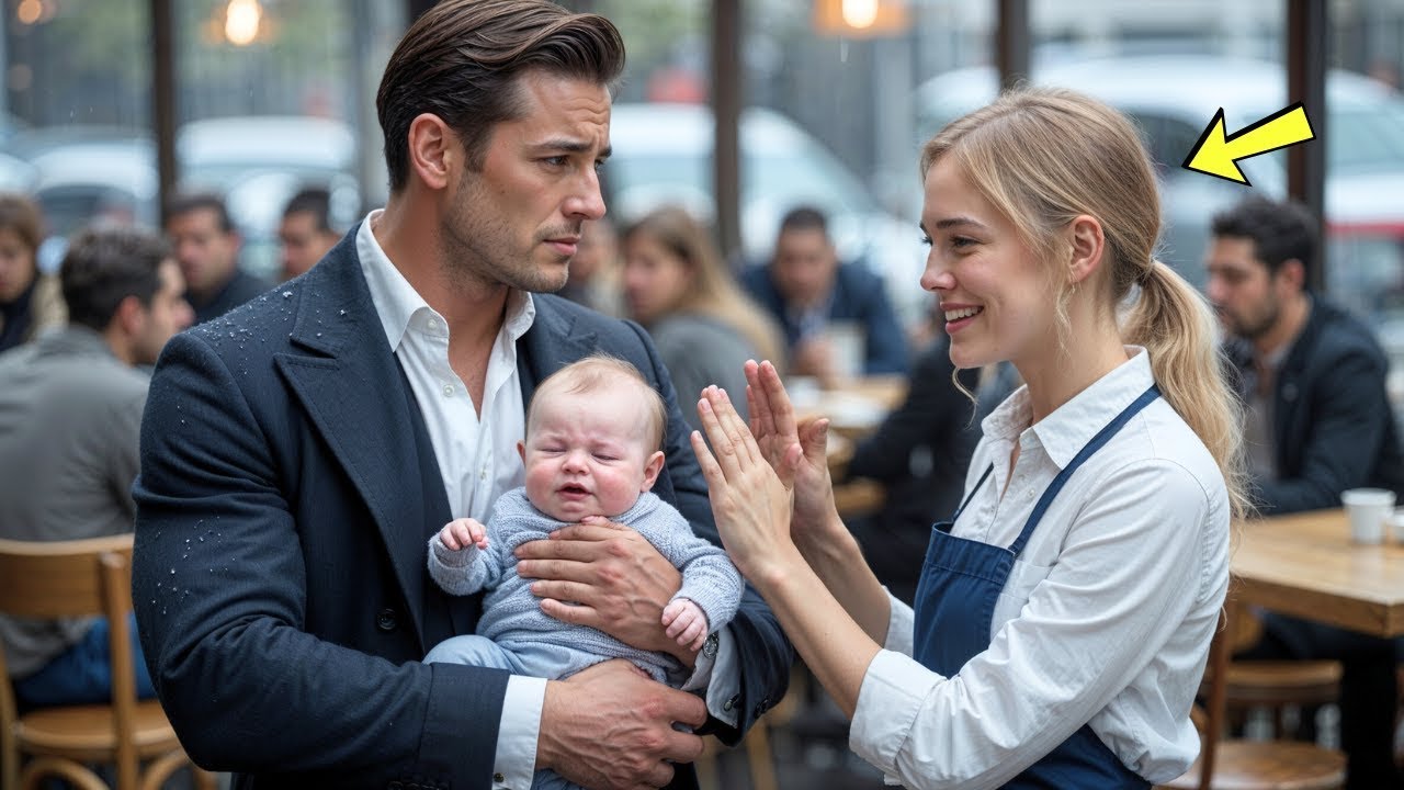 Her hands wiped the counter with slow, steady strokes. The cafe radio hummed soft jazz beneath the gentle patter of rain. Then came the cry sharp, high-pitched, unrelenting. A baby’s whale sliced through the stillness. Ella paused midwipe, her head turned toward the sound, brows lifting. In the far corner, a man stood beside a stroller. Tall, sharply dressed in a charcoal coat, hair damp from the rain.