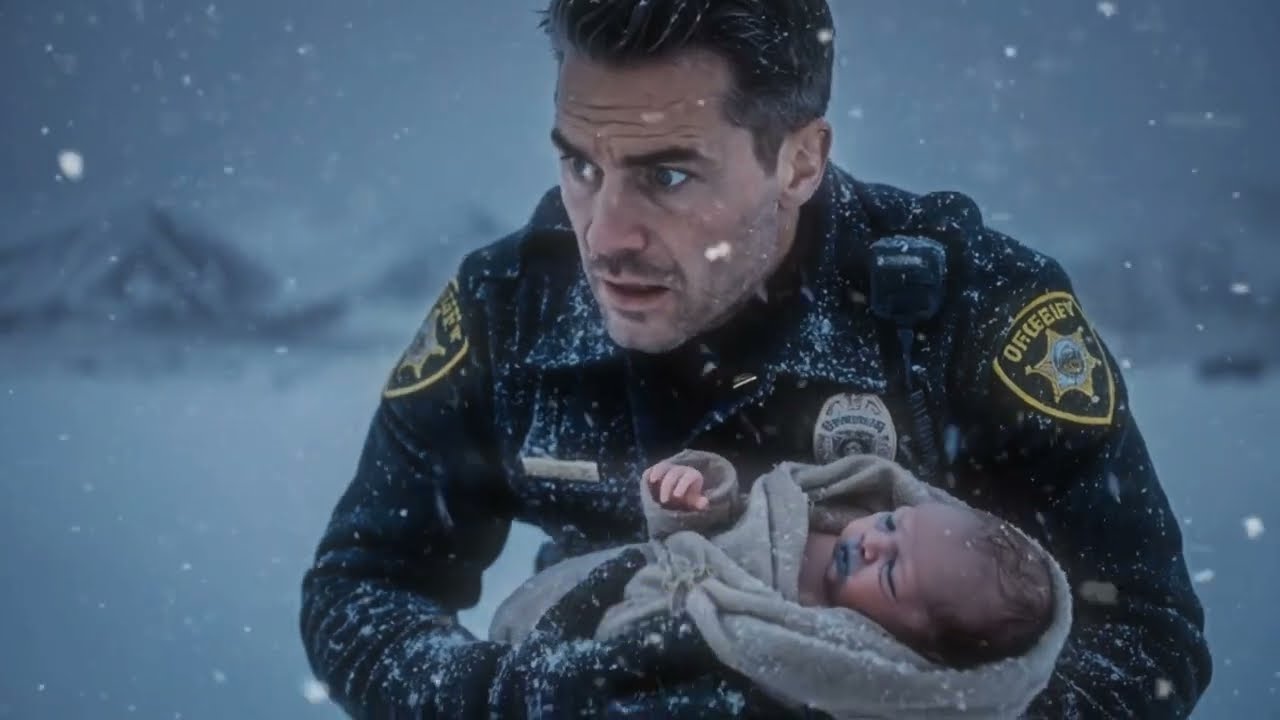 Inside his patrol truck, Officer Leo Carter drove slowly through the storm. He was 35, a man built like a soldier, but carrying the stillness of someone who had seen too much loss. His Navy winter sheriff’s jacket bore a dusting of frost. His dark hair streaked faintly with silver, clung damp against his forehead. The cab smelled faintly of coffee and cold metal.