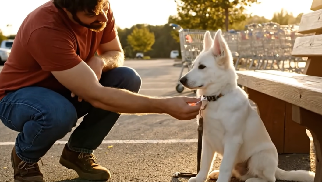 There it was again, a soft, trembling cry. He followed the sound to a wooden bench near the row of shopping carts. And there, sitting at one end of the bench, was a tiny white German Shepherd puppy. The little dog wasn’t hurt, but it had been tethered loosely to the bench with a soft cotton leash, the kind used for small pets.