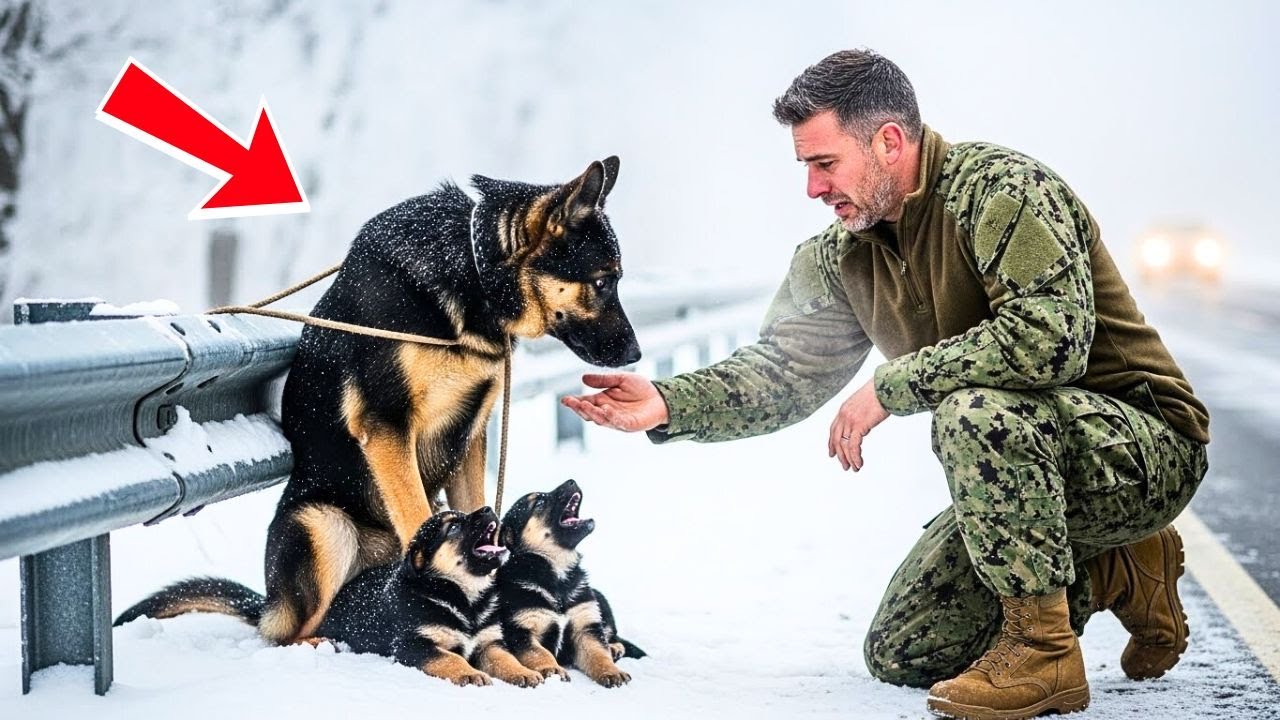 A mother German Shepherd stood chained beside a frozen guard rail. Her two puppies pressed against her trembling legs. Their fur was stiff with ice. Their cries had gone silent. On that same road, a Navy Seal named Ethan Cole drove through the storm, not looking for life, but running from his own. The war had ended years ago, but in his mind, it never stopped.