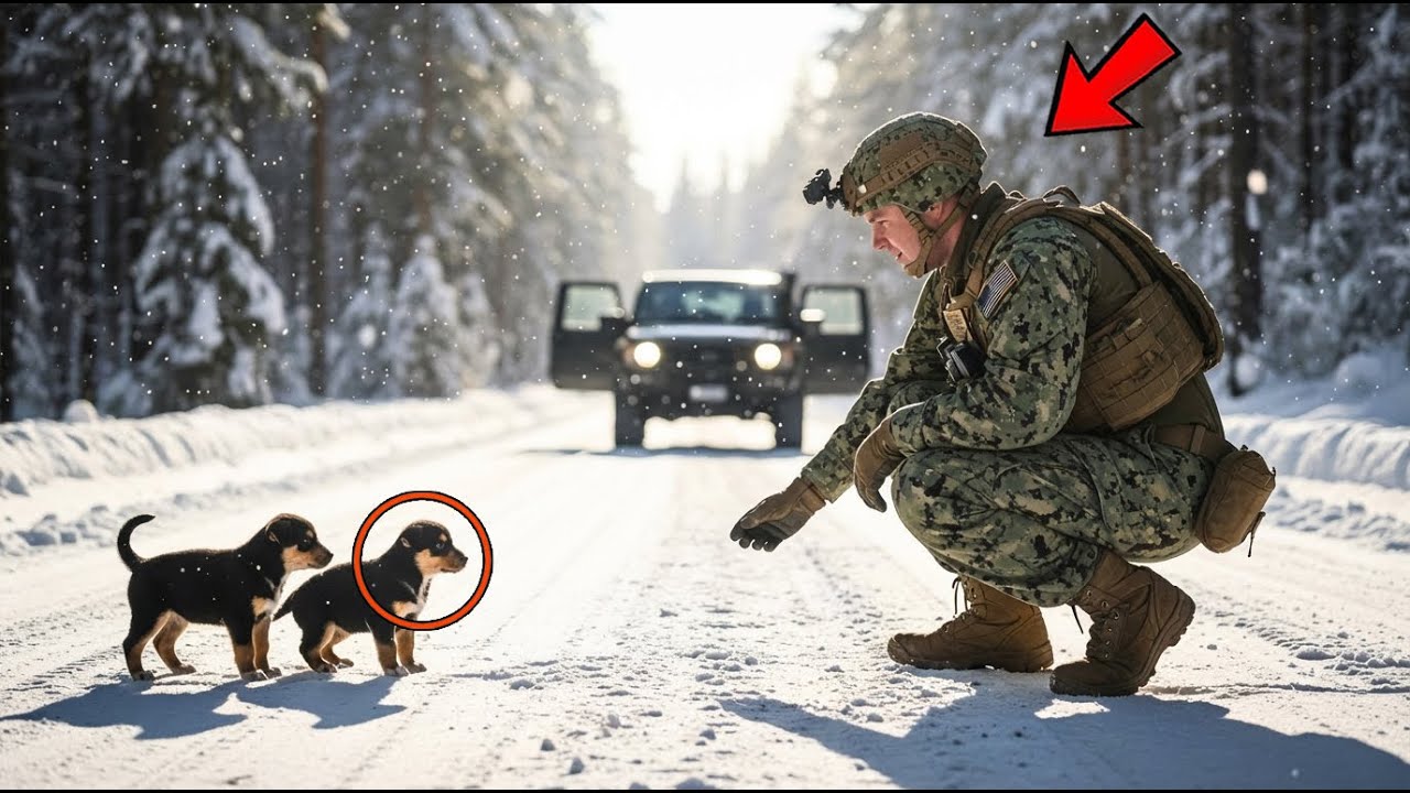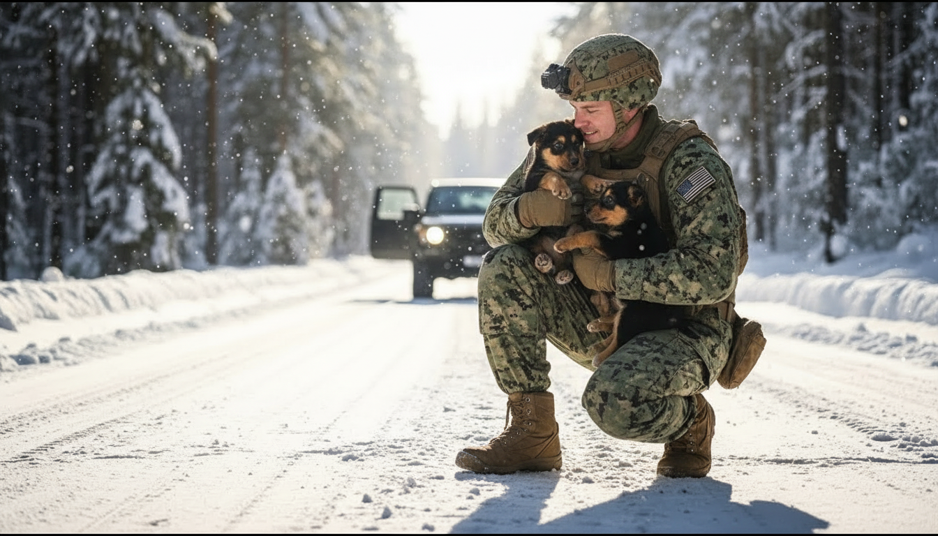 Two tiny German Shepherd puppies huddled together in a wooden crate, their fur stiff with ice, their breaths fading with every gust of wind. No one was supposed to find them. Miles away, a different kind of ghost wandered the same frozen road. A Navy Seal haunted by war.