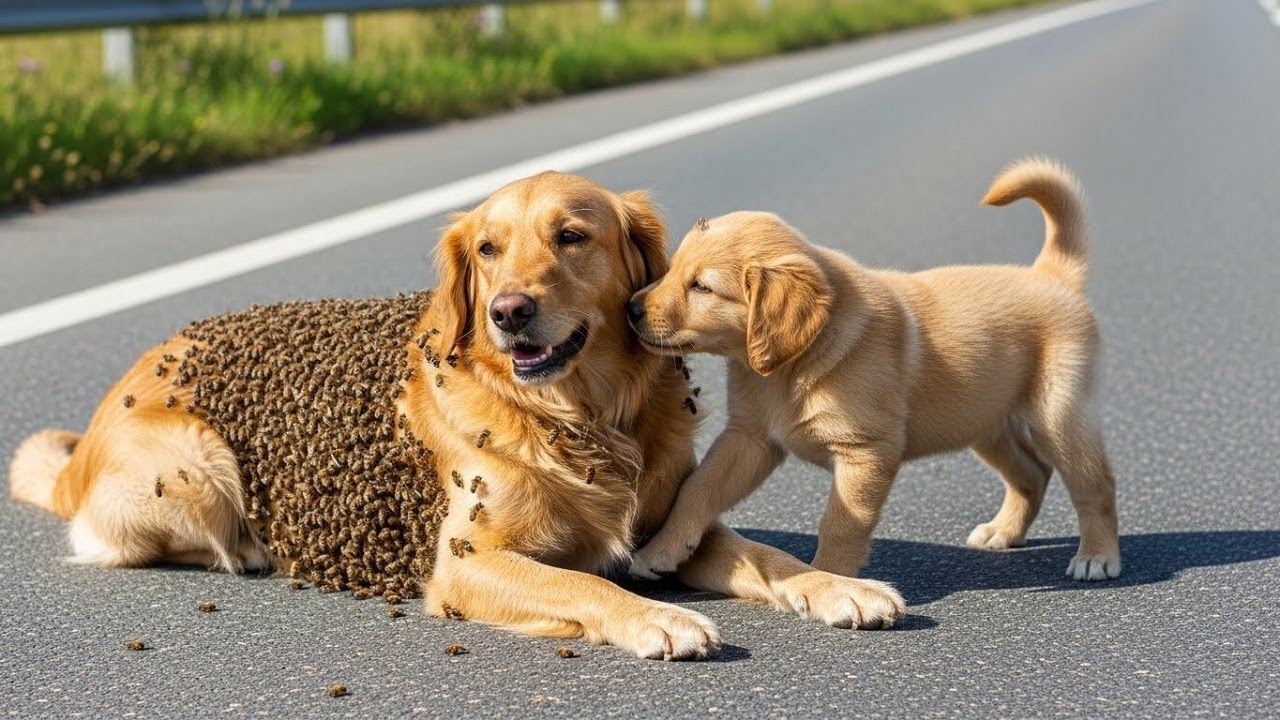 But the pain wasn’t what mattered most. Beneath my belly, there was a small, fragile warmth: my son, Barnaby. Even as the venom made my body tremble, even as my eyes swelled shut and my breath came in ragged gasps, I couldn’t move. The instinct to protect locked me in place. I curled into a ball, trying to create a dome of bone and thin fur to shield my little life. All I could do was whine softly, begging the buzzing to stop, begging the pain to spare my pup.