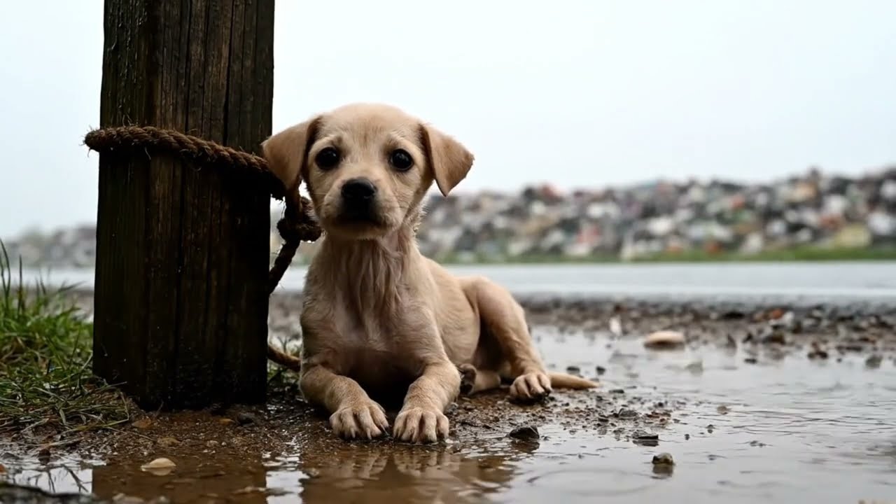 The rain had been falling steadily since early morning, soaking the quiet road that curved past an aging landfill on the outskirts of a small town in Oregon. The sky was a dull sheet of gray, heavy and unmoving, as though the whole world were trapped beneath it. Near a leaning wooden post stood a small, shivering puppy, tied tightly with a rough rope that cut into the damp fur around his neck.