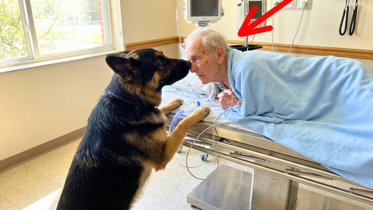 Elias Turner, 82 years old, his body fragile beneath white sheets. Tubes ran from his arms, monitors blinked softly around him. His breathing was thin and uneven. But the moment Bruno entered the room, something shifted. Bruno walked carefully to the bedside, one slow step at a time. His tail stayed low, his deep brown eyes filled with sorrow and confusion.
