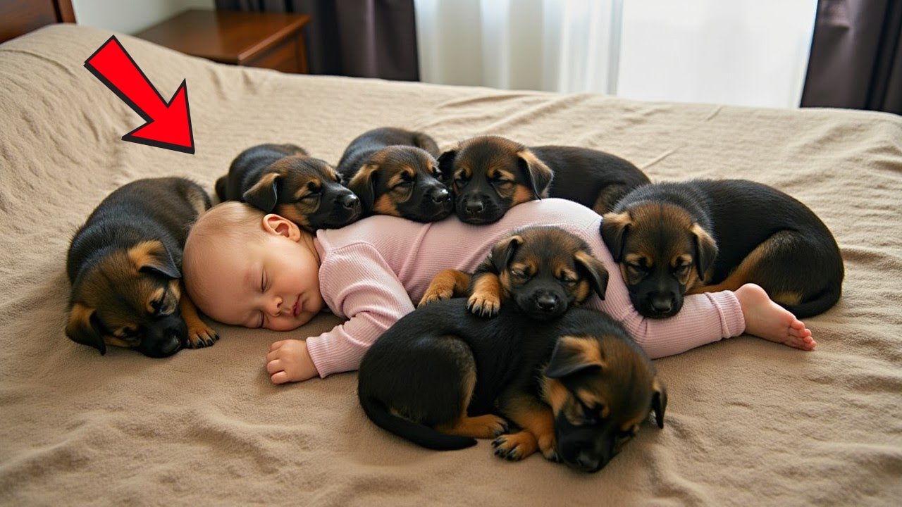 In the center of the bed slept a little girl named Emily Carter, barely a year old. Her breathing was slow, steady. Her tiny chest rose and fell beneath what looked like an unusual blanket. It wasn’t a blanket. Seven German Shepherd puppies were curled tightly around her body. They lay pressed against her sides, her legs, her back.
