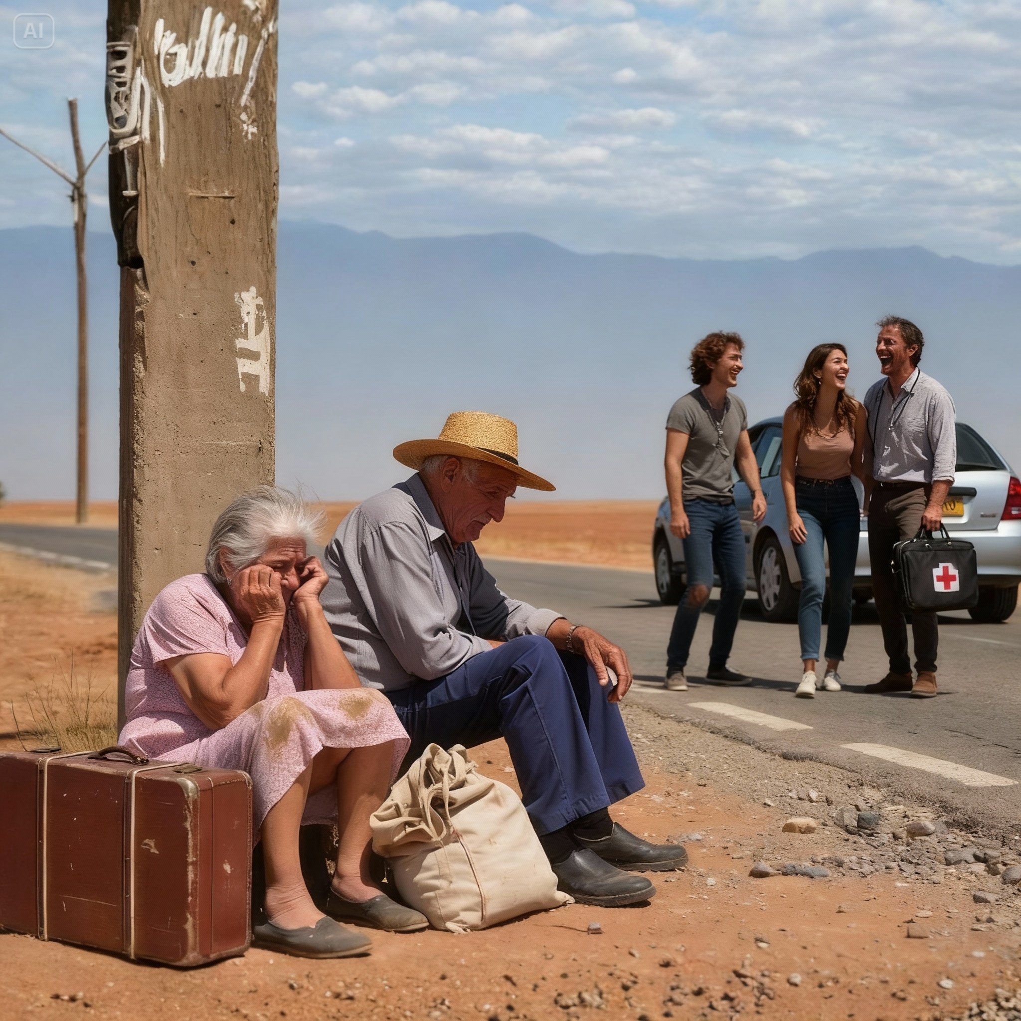 As I got out, a wave of heat hit me, smelling of earth and engine. I walked toward them, raising a small cloud of dust. The woman’s eyes were red, her cheeks furrowed by rivers that had already run dry; the man, however, kept his gaze fixed on the ground, as if the asphalt held the answer he had lost.